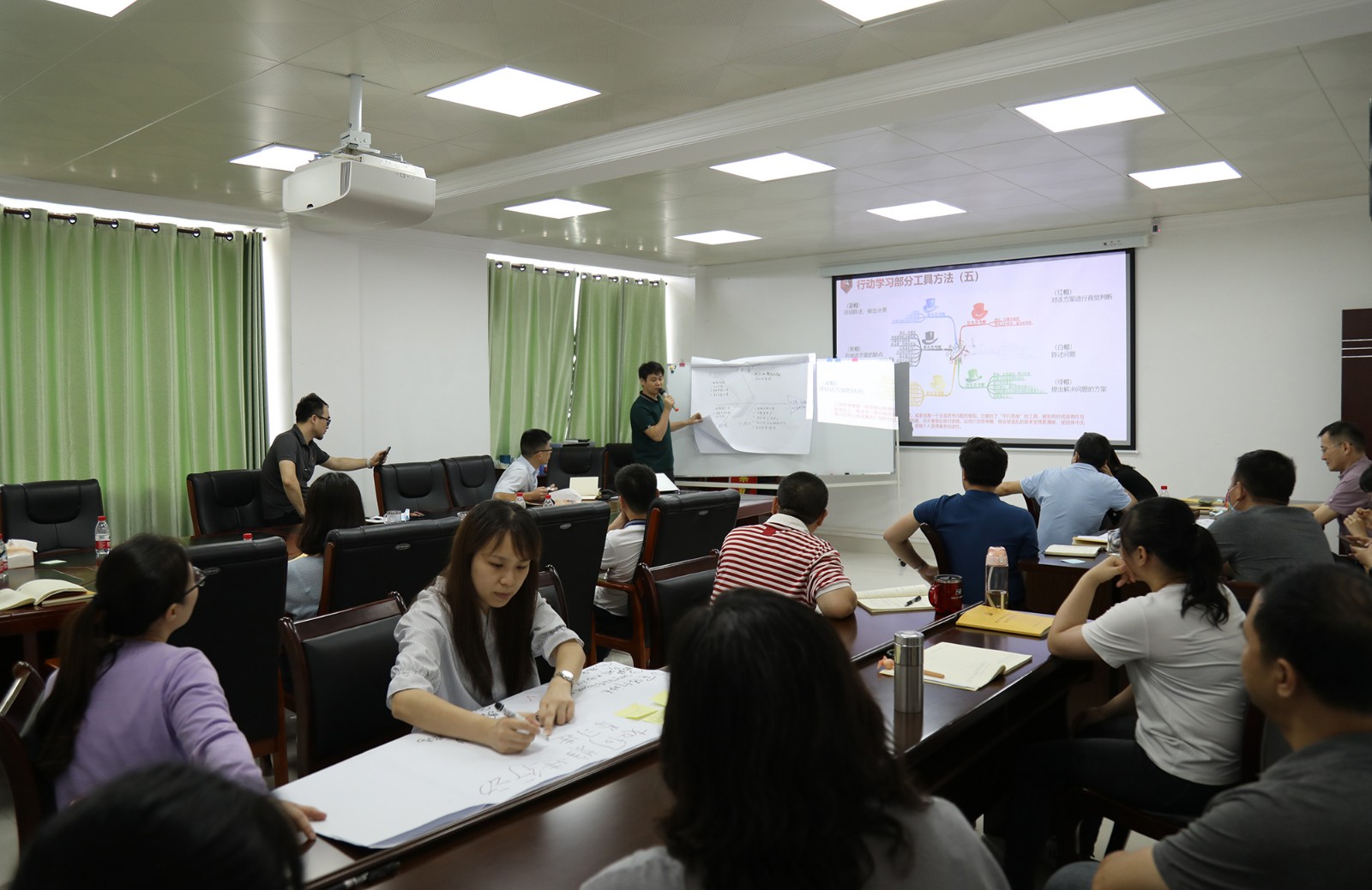 隨后各小組派代表依次上臺分享小組研討成果,其他小組則分別運(yùn)用“黃帽子”(好的)和“黑帽子”(不足)對其他小組展示成果進(jìn)行點評。在實操演練過程中,各小組成員積極參與踴躍發(fā)言,會場研討學(xué)習(xí)氛圍濃厚,大家在學(xué)習(xí)、討論、交流的過程中增長了用行動學(xué)習(xí)方法、工具解決實際問題的能力。